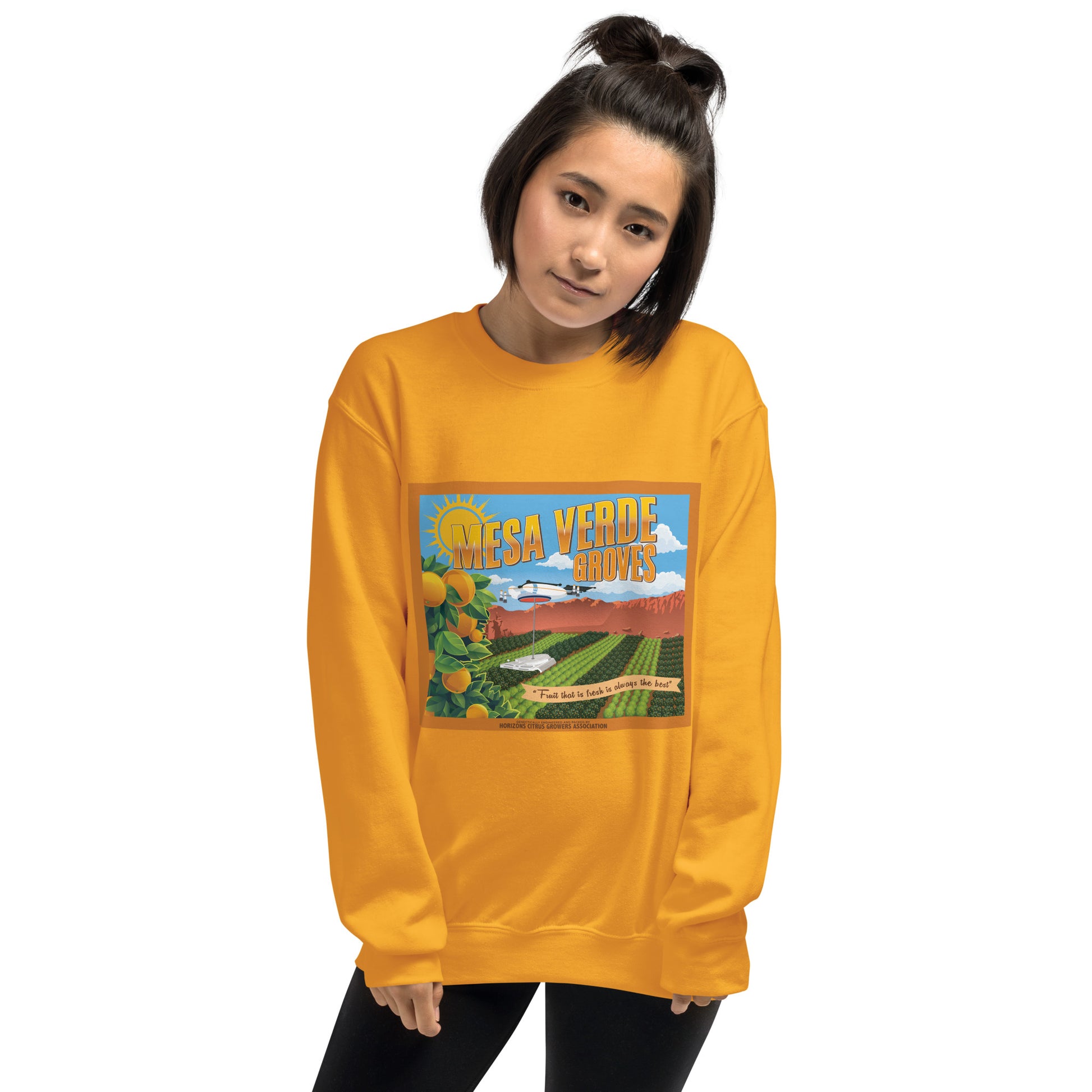 Cozy up to a future where comfort meets innovation—just like the flourishing fields of Mesa Verde Groves, where citrus blossoms bloom beneath solar skies. This ultra-soft sweatshirt, made from a balanced 50/50 cotton-polyester blend, offers the perfect mix of warmth, durability, and everyday ease. The air-jet spun yarn gives it a smooth, luxurious feel, while the quarter-turned design keeps it looking crisp and fresh—no matter where your journey takes you. Whether you’re reminiscing about EPCOT’s golden era or just embracing a peaceful afternoon, this is more than just a sweatshirt—it’s a wearable memory from a world that once dreamed big. From orchard to outer space… layer up in the spirit of Horizons.